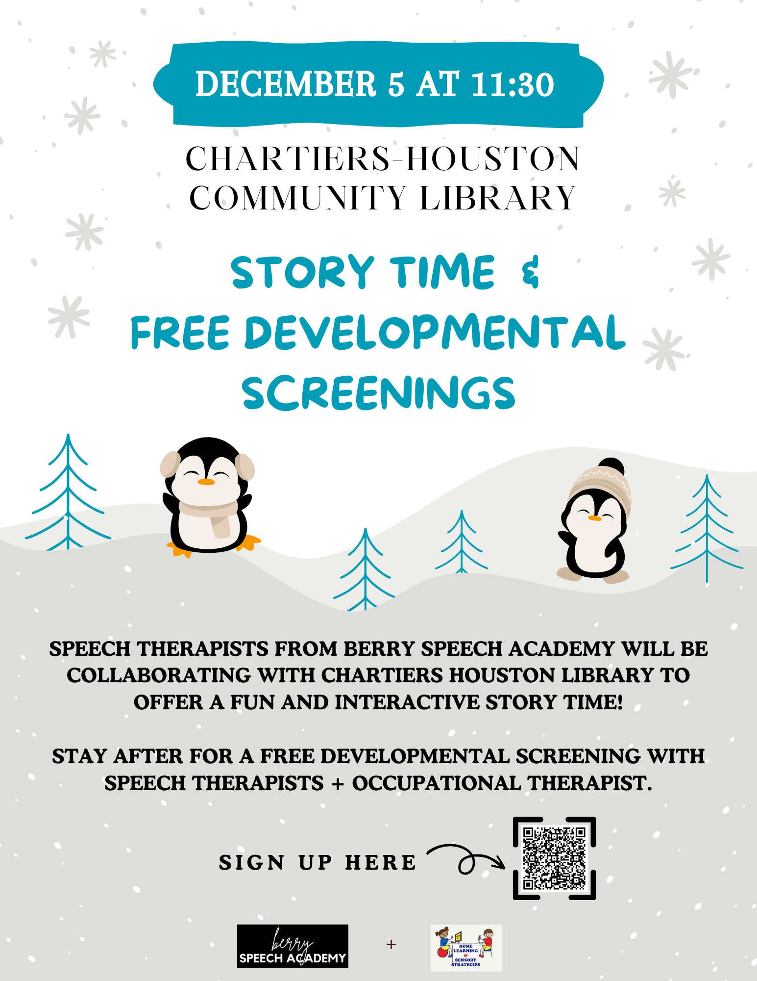 Speech therapists from BSA will be collaborating with Chartiers Houston Library to offer a fun and interactive story time! Stay after for a free developmental screening with speech therapists + occupational therapist from Home Learning & Sensory Strategies.